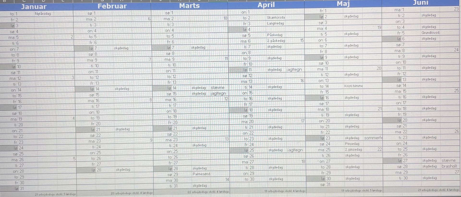 Juni: tirs. 2 + tirs. 9 + tirs. 16 + tirs. 23 + tirs. 30